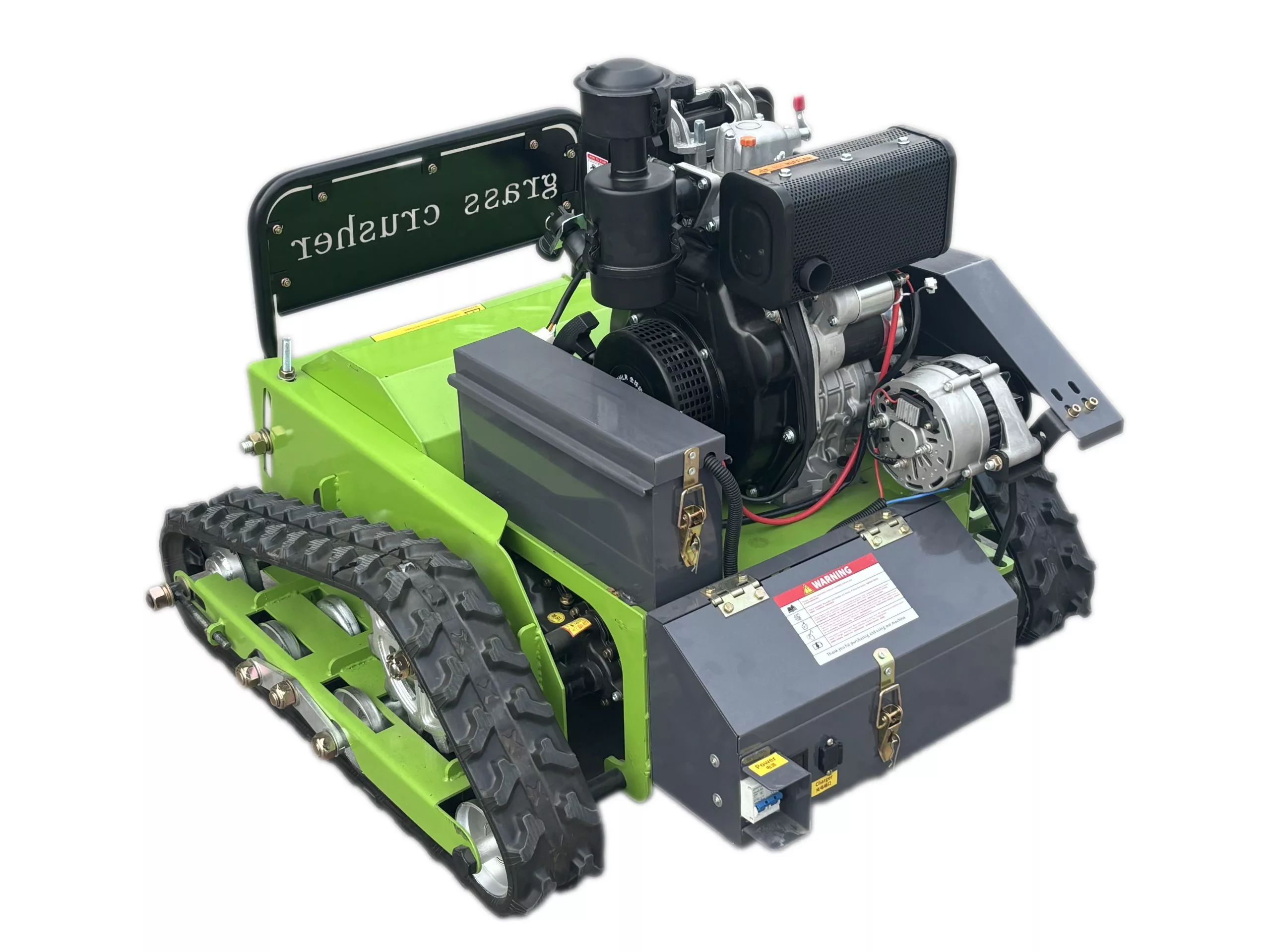 Die H-550J ist eine wahre Kraftmaschine, die selbst schwierigstes Unterholz und hohes Gras mühelos bewältigt. Ihr Herzstück ist ein leistungsstarker Benzinmotor, der nicht nur das hochfeste Mulchmesser antreibt, sondern auch als Generator dient. Dieser lädt die integrierten Batterien, die wiederum die Kettenantriebe mit Strom versorgen. Dieses innovative Hybrid-System gewährleistet eine konstante und zuverlässige Leistung, selbst unter extremen Bedingungen, und ermöglicht es der Mähraupe, steile Hänge und unebenes Gelände souverän zu meistern.