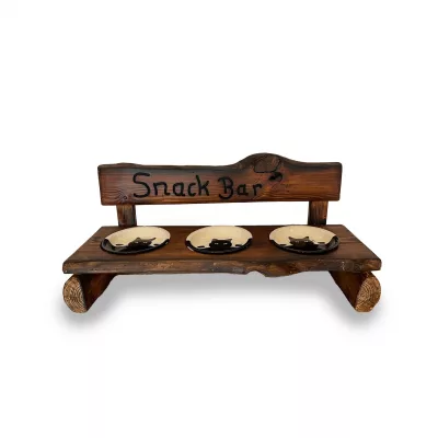 Die Futternäpfe sind wahlweise ein rustikaler Tonteller (Ø ca. 13 cm) oder eine Edelstahlschale (Ø ca. 11 cm). Der Tonteller verleiht der Bank einen natürlichen, handgearbeiteten Charme, während die Edelstahlschale spülmaschinenfest, hygienisch und rostfrei ist – ideal für Wasser, Trocken- oder Nassfutter.